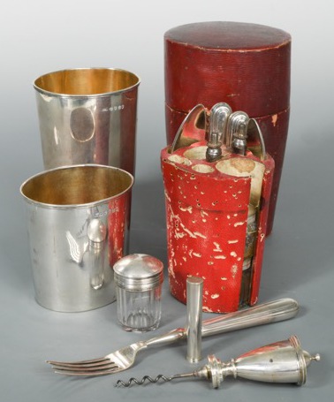 The Silver-gilt cups and smart red case would have been the perfect match for a Georgian officer's uniform and undoubtedly Thackeray's notorious anti-heroine, Becky Sharp, would have had her eye on this desirable set while her husband, Rawdon Crawley, was on campaign at Waterloo.